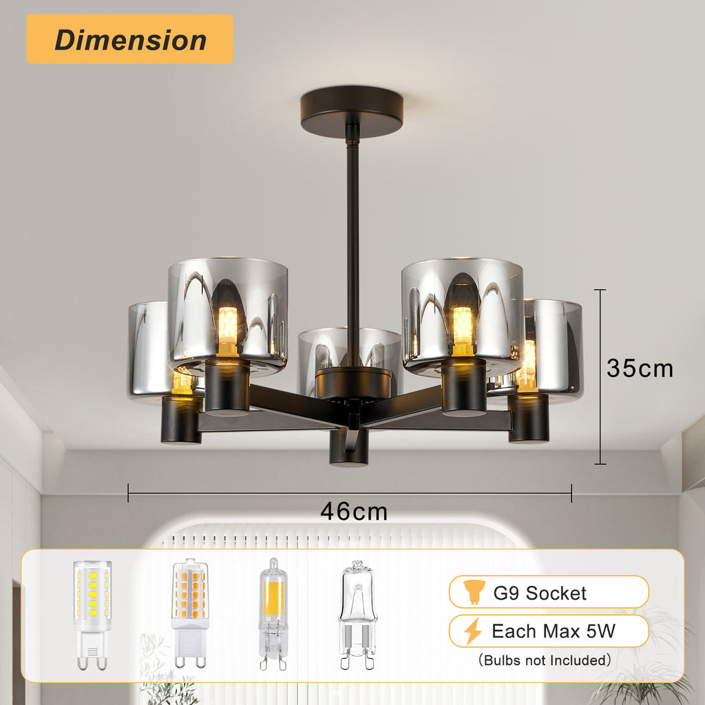 - CHANDELIER SPECIFICATIONS: Measuring 46cm x 46cm x 35cm, semi flush ceiling light operates on a 220-240V voltage and accommodates G9 bulbs with a maximum power of 5x5W. This light is dimmable compatible and is perfect for use with G9 LED lamps. (Note: Bulbs and dimmers are not included.)