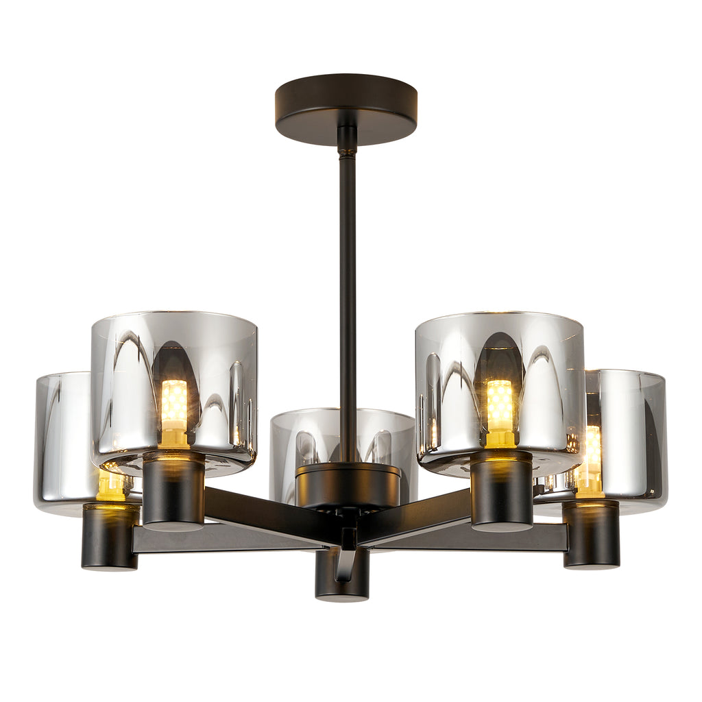 5 Lights Semi Flush Ceiling Lamp with Smoked Glass Shades, Matt Black
