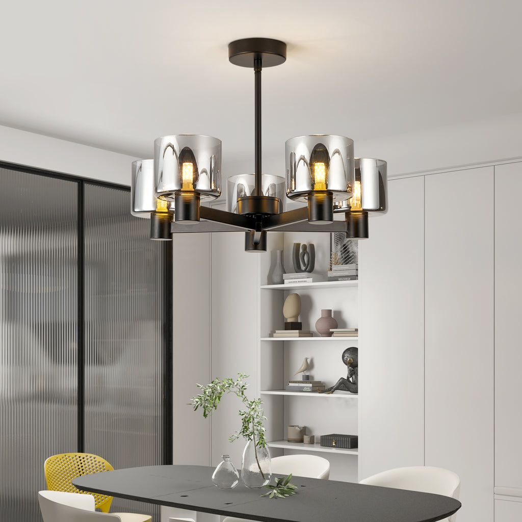 - SLEEK & CONTEMPORARY DESIGN: Featuring a contemporary luxe design, this chandelier is made of high-quality metal materials, stunning matt black finish, and a sturdy and durable base. With 5 artistic smoke-gray glass lampshades, it creates a unique lighting atmosphere for the whole room.