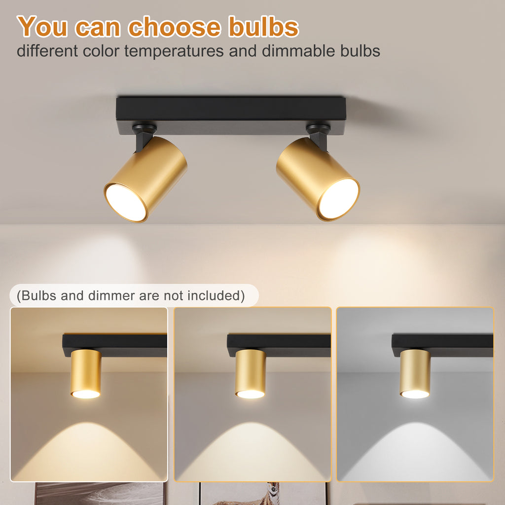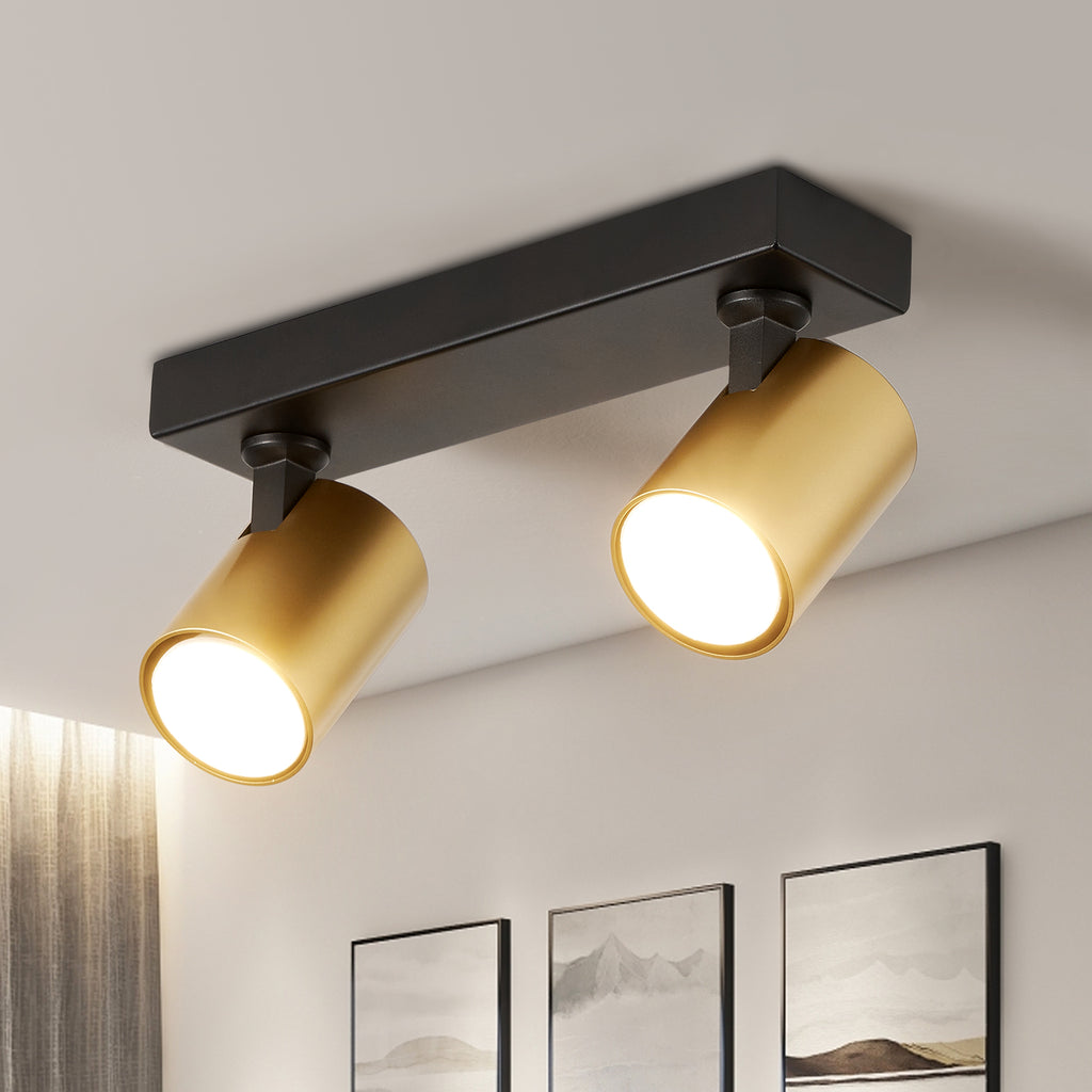 This sleek dual-head track light combines practicality and modern style, featuring a matte black bar with two adjustable gold cylinder lamps. Each head can be independently positioned to direct light precisely where needed, making it ideal for highlighting artworks, workspaces, or accenting key areas of a room. The contrasting colors add a contemporary flair to any decor, enhancing functionality with a touch of elegance.