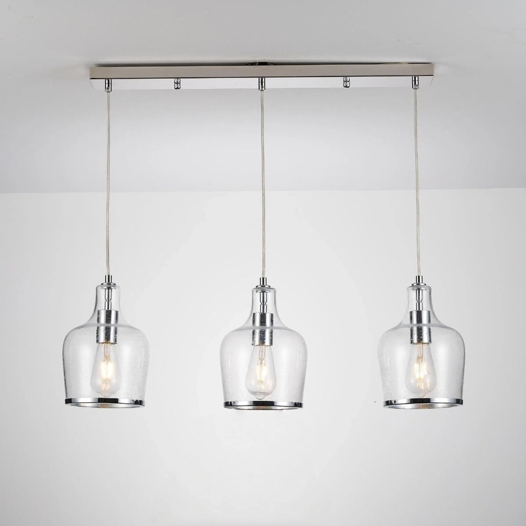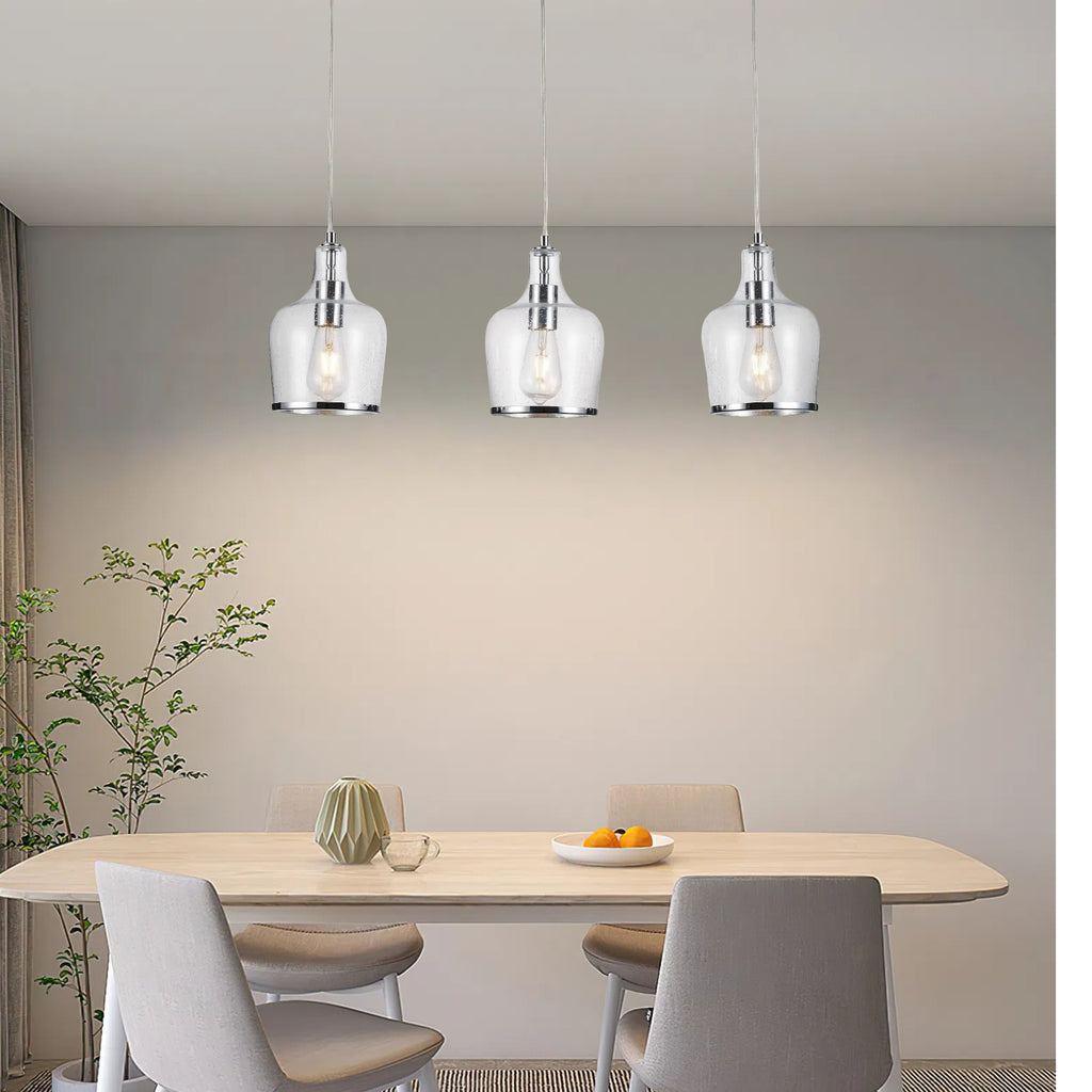 This 3-light pendant fixture features clear seeded glass shades and a Polished Chrome canopy, offering a perfect mix of industrial and modern design. Ideal for kitchen islands, dining tables, or loft spaces, it provides warm, ambient lighting while making a stylish statement in any contemporary interior.