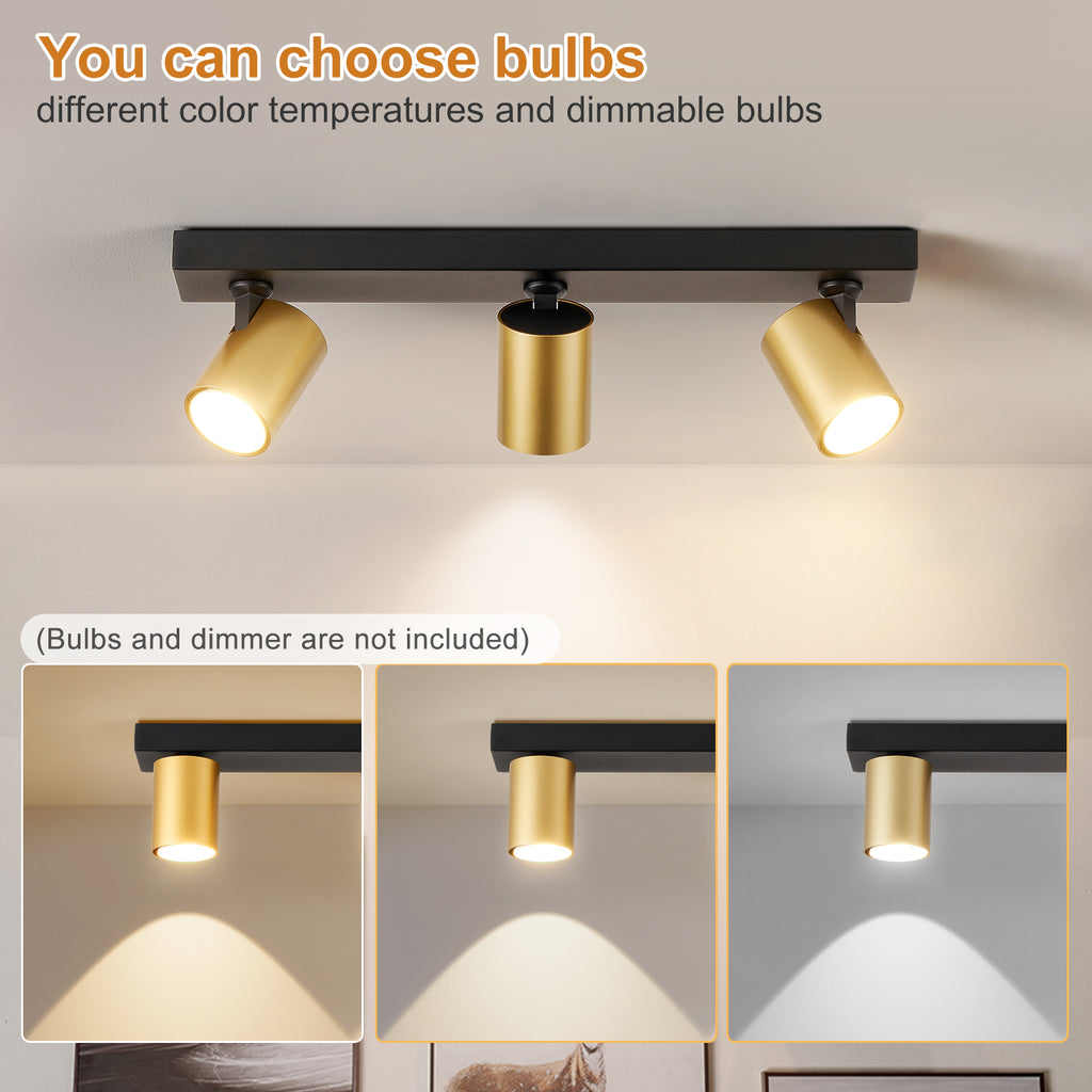 This stylish three-head track light features a robust matte black bar with elegant gold cylinder lamps. Each lamp is adjustable, allowing for targeted illumination perfect for highlighting artworks, enhancing reading areas, or creating ambient lighting in any room. The combination of dark and metallic tones adds a modern yet warm element to the interior design, ideal for both contemporary and traditional settings.