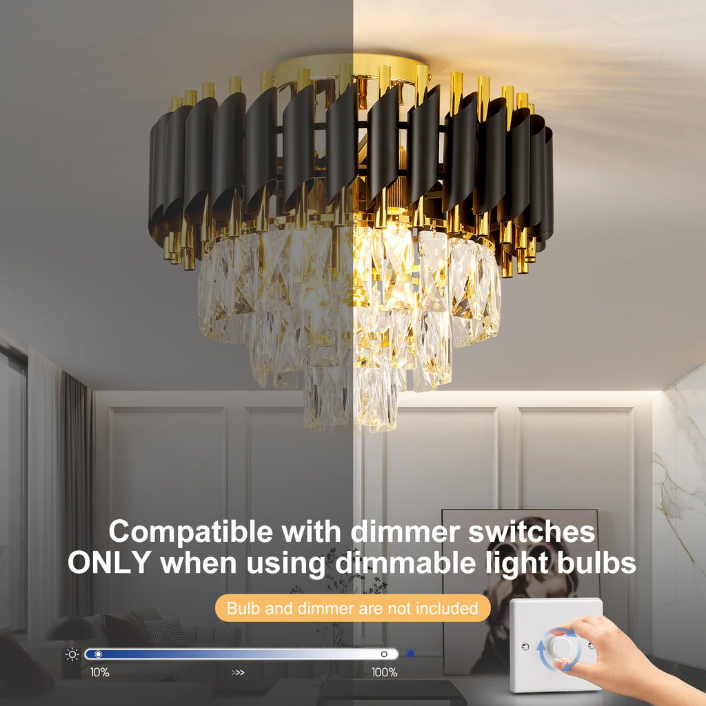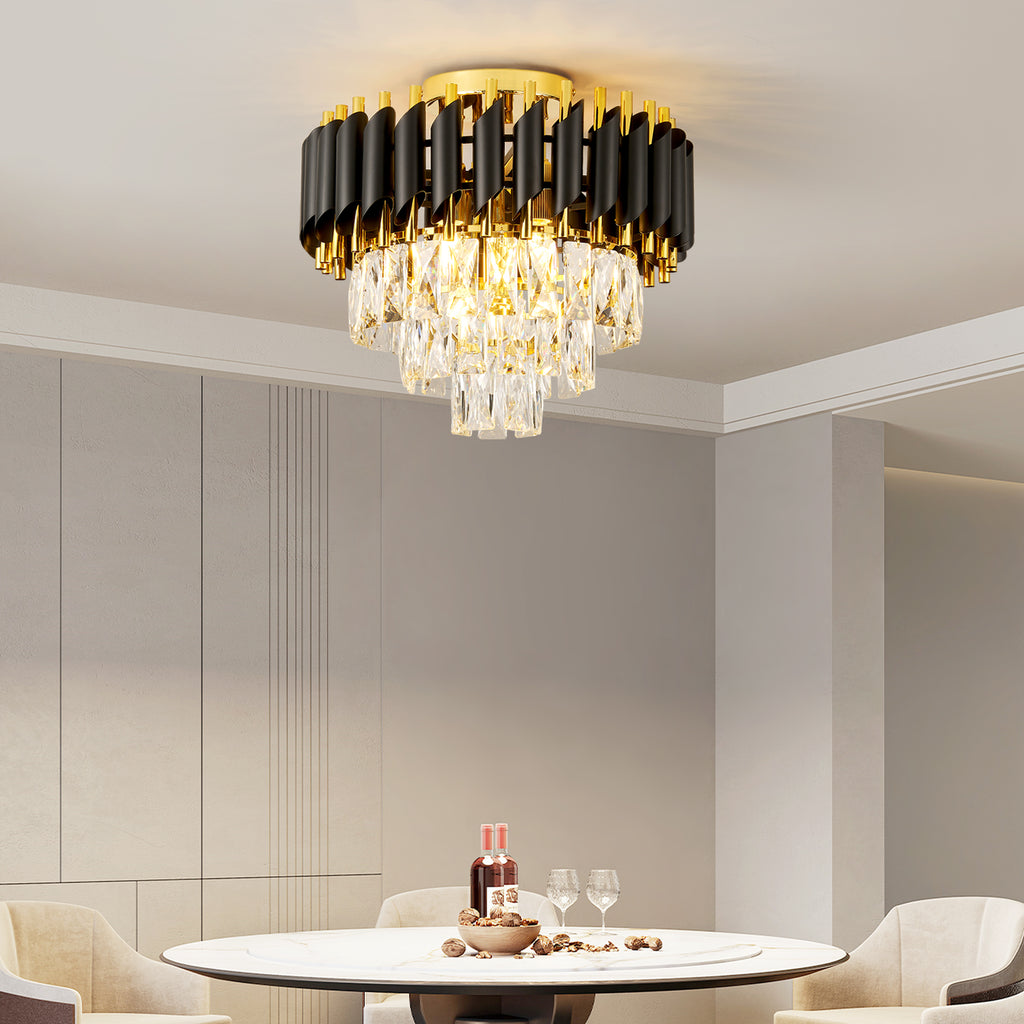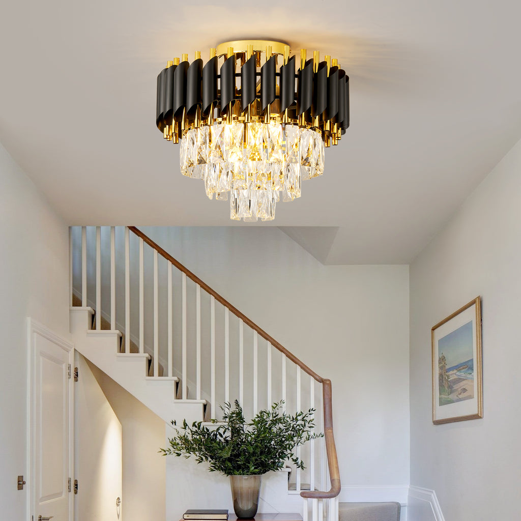 HARPER LIVING Crystal Ceiling Light, Modern Chandelier Lighting with 3 Tiers Crystals, Black & Gold Finish, Semi Flush