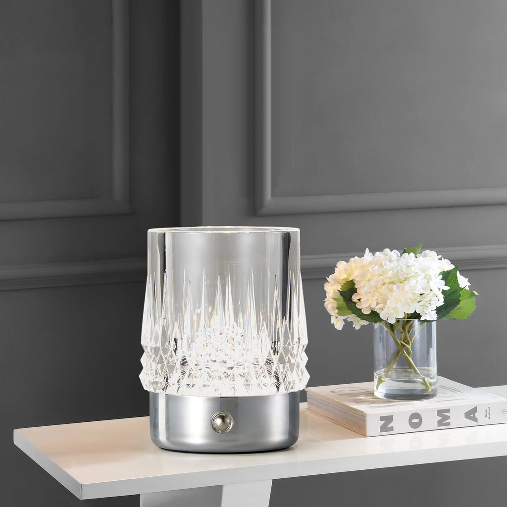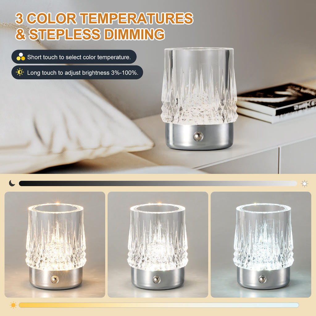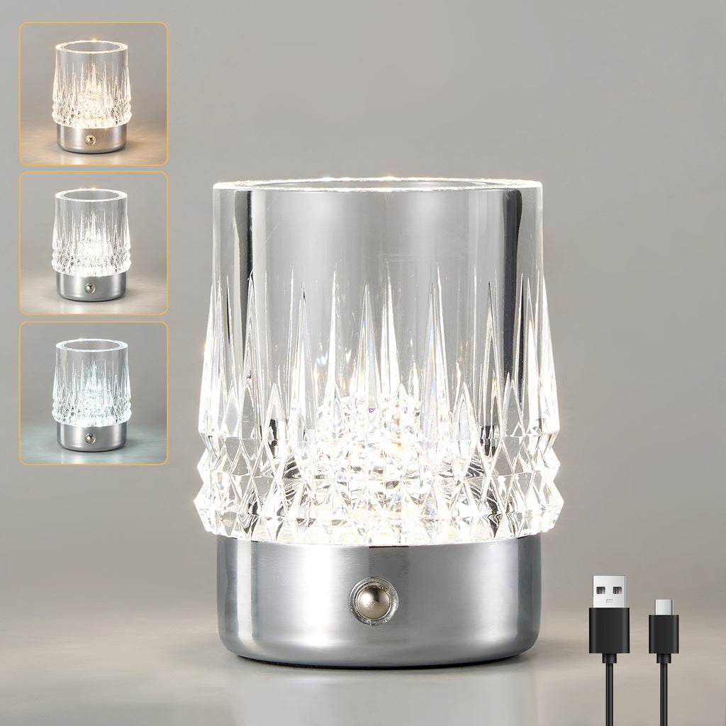 This rechargeable table lamp showcases a stunning crystal-like design, brilliantly illuminated by an internal LED source. The sleek, brushed metal base features a touch-sensitive switch for easy operation. It offers multiple lighting modes, including three color temperatures to suit various moods and settings. With its USB charging capability and elegant appearance, this lamp is perfect for adding a touch of luxury and functionality to any space.