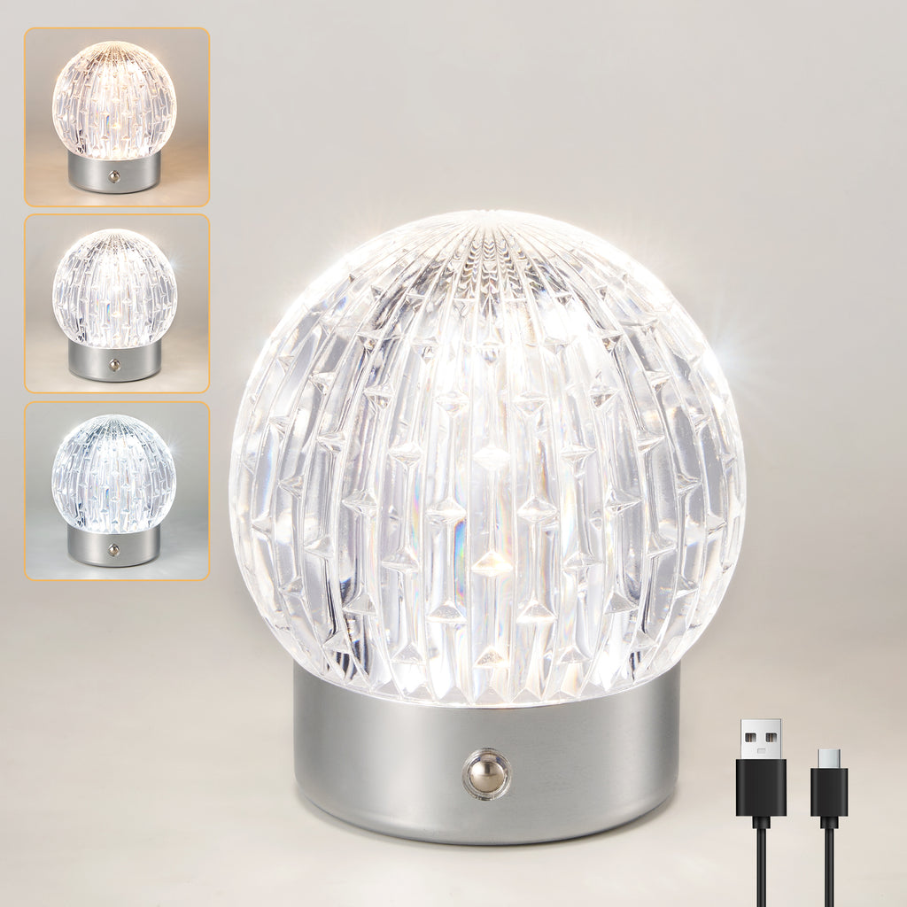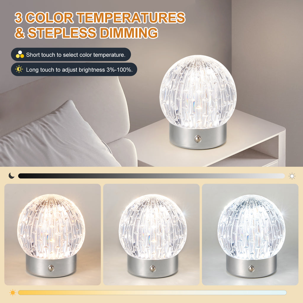 This exquisite table lamp features a crystal-like dome that beautifully diffuses light, creating a stunning sparkle effect across the room. The base is crafted in sleek, brushed metal with a convenient touch sensor for easy operation. USB rechargeable, this lamp offers both elegance and modern convenience, perfect for adding a touch of glamour to any setting.