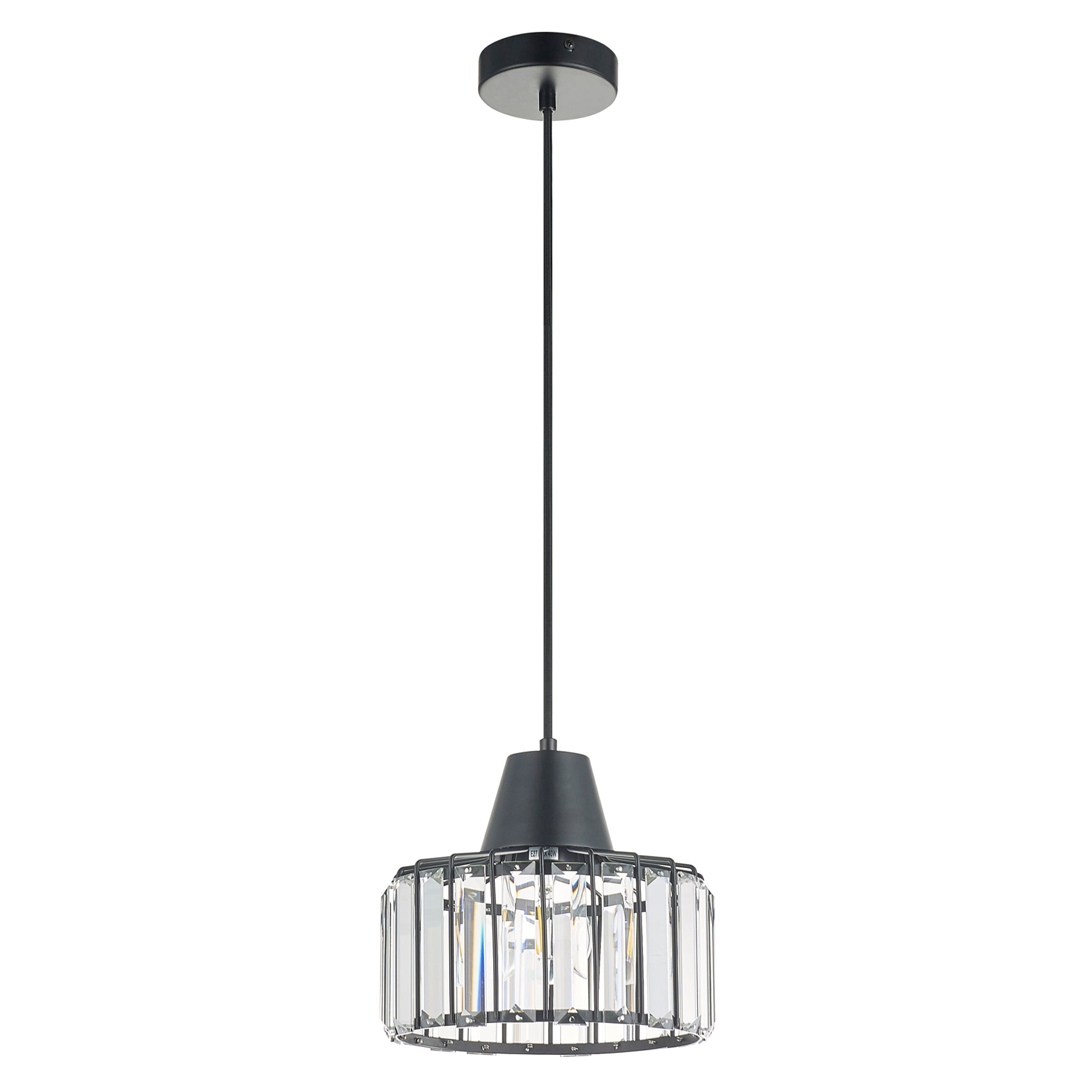 Single Black Finish Pendant Light with Decorative Crystal Shade, Adjustable Height, Dimmable, Class 2 Double Insulated