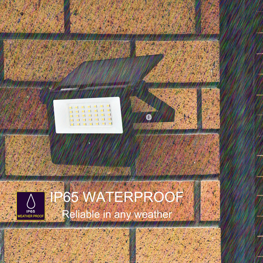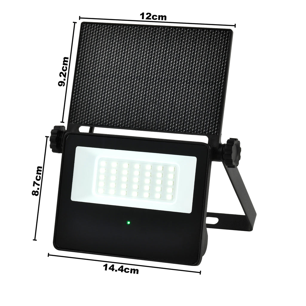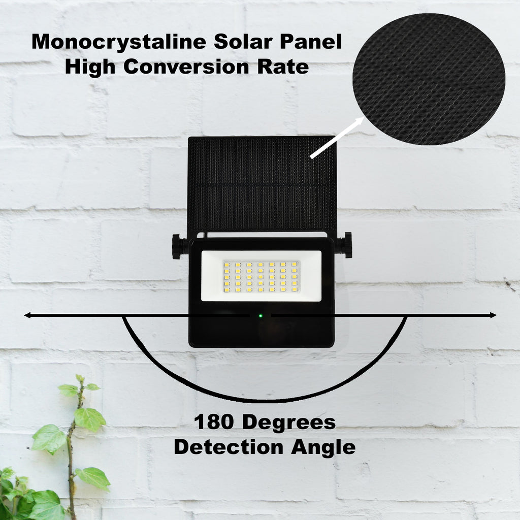 This Floodlight contains a Solar Photocell which can charge up to 8 Hours to last up to 2 rainy days with full charge, also includes a sensor with a distance between 6 and 10 meters, with a detection angle of 180 degrees and the sensor will remain on for only 22 seconds after being triggered to help save energy