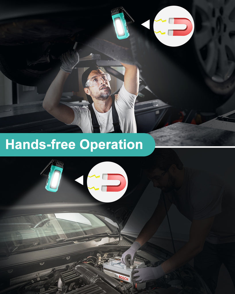 - ROTATABLE FOLDING MAGNETIC HOOK-This bright floodlight has a built-in adjustable bracket with magnets for hands-free operation, 180° rotation, and built-in metal clips to fix them where you need them, so you can work with both hands, to meet your different requirements for lighting your work area.