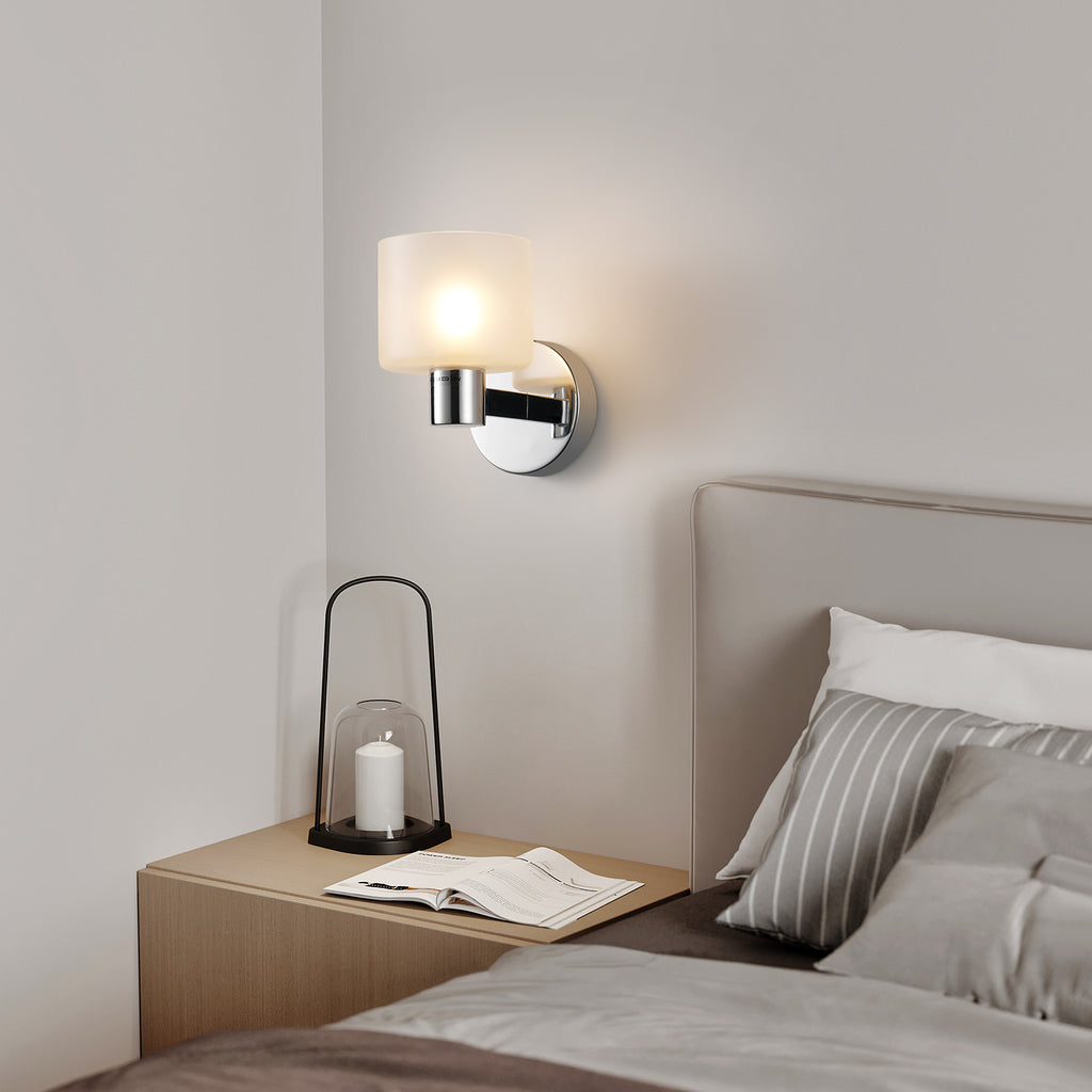 This contemporary wall light features a sleek chrome base and a Frosted cylindrical glass shade, offering a stylish blend of modern elegance and soft illumination. Ideal for living rooms, hallways, or bedrooms, it provides warm, ambient lighting while serving as a sophisticated accent piece in any interior décor.